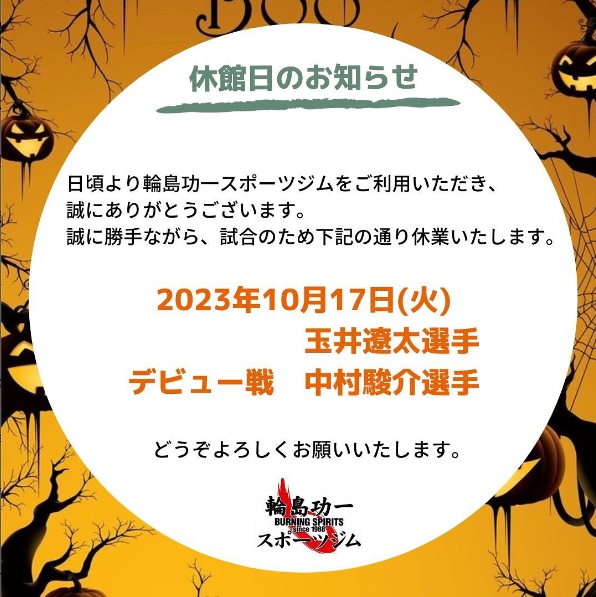 日頃より輪島功一スポーツジムをご利用いただき、誠にありがとうございます。誠に勝手ながら、試合のため下記の通り休業いたします。