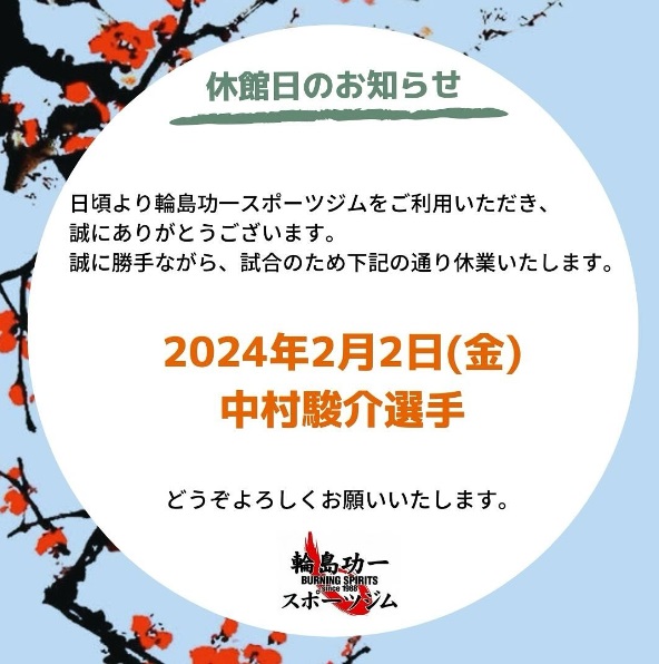 日頃より輪島功一スポーツジムをご利用いただき、誠にありがとうございます。誠に勝手ながら、試合のため下記の通り休業いたします。