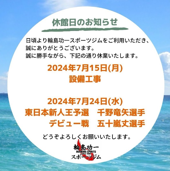 日頃より輪島功一スポーツジムをご利用いただき、誠にありがとうございます。誠に勝手ながら、下記の通り休業いたします。