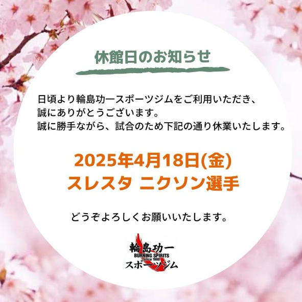 日頃より輪島功一スポーツジムをご利用いただき、誠にありがとうございます。誠に勝手ながら、試合のため下記の通り休業いたします。