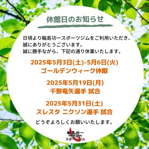 日頃より輪島功一スポーツジムをご利用いただき、誠にありがとうございます。誠に勝手ながら、下記の通り休業いたします。