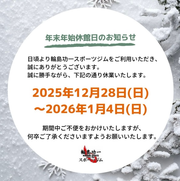 日頃より輪島功一スポーツジムをご利用いただき、誠にありがとうございます。誠に勝手ながら、下記の期間を休館させていただきます。